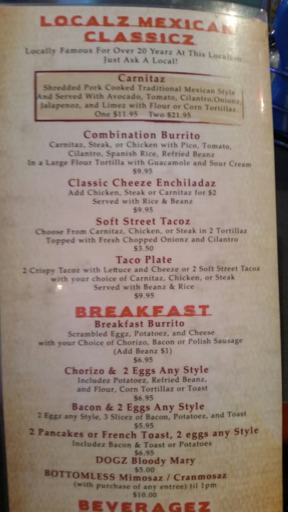 Bacon or sausage and two eggs, served with breakfast potatoes and your choice of toast. Chorizo and scrambled eggs served with tortilla and refried beans.
