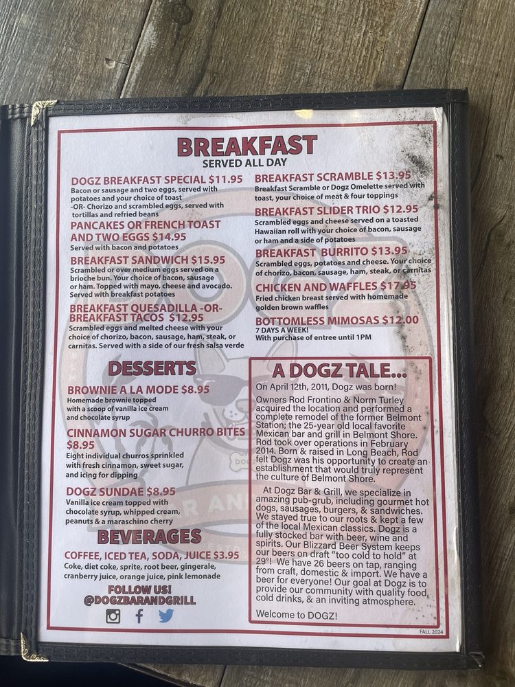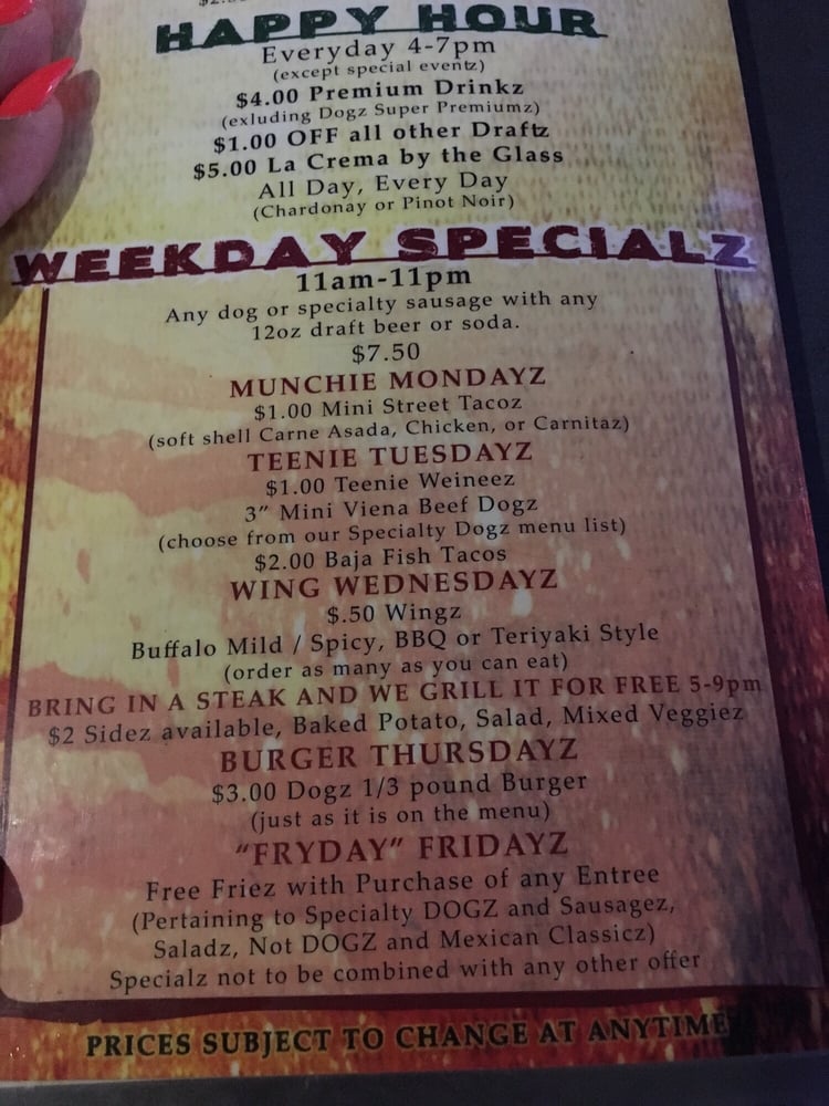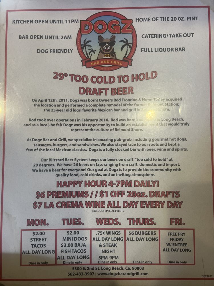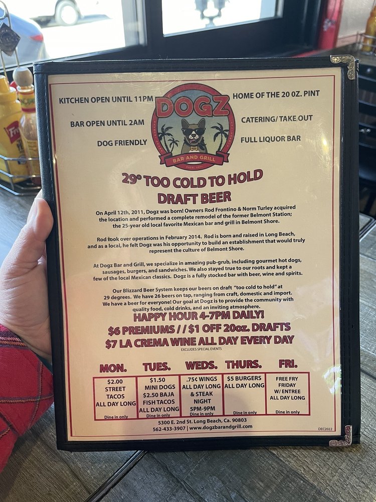 Welcome to DOGZ Bar and Grill, a lively hotspot located in Long Beach, CA, where hot dogs meet a vibrant sports bar atmosphere. With a menu that delights, you can start with their Burger Slider Trio or savor a steaming Chili Bowl. Their specialty hot dogs, like the BBQ Dog topped with scrumptious Applewood bacon, provide a mouthwatering experience. Pair your meal with thirst-quenching drinks during the bustling Happy Hours, especially on Wednesdays and weekends when the energy is electric.